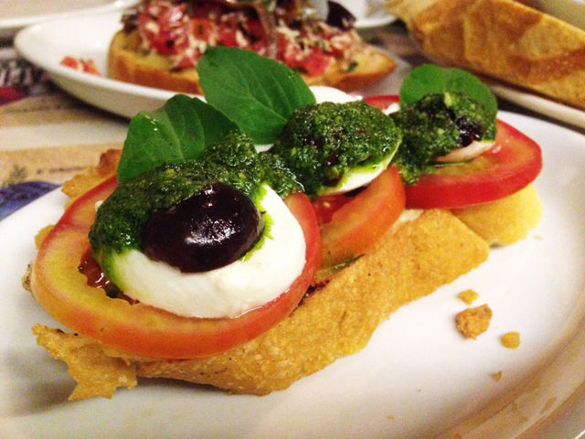No DUO – Bruschetteria & Bottegame conquistaram os molhos Bolonhesa e Pesto, muito bem orquestrados pelo chef Erick Alsaro . O Bolonhesa provei numa entrada imperdível, no melhor espírito chucar o pão na panela fumegante do fogão da nonna. É a Scarpetta alla bolognesa (minha foto de abertura) – molho bolonhesa na cumbuca, acompanhado de pão para raspar o fundo (tá escrito assim no cardápio minha gente, então vamos lá!). O saboroso e equilibrado Pesto, veio sobre a Bruschetta Caprese – tomate italiano, mussarela de búfala, azeitona e pesto.