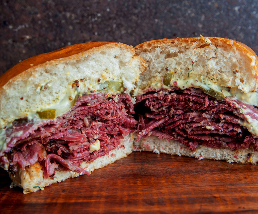 Porn Brisket - Pastrami de peito de boi cozido lentamente e defumado, picles e mostarda feitos na casa, servido no pão branco. R$33