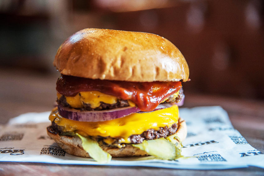 Smash - Dois burgers de 100g, cheddar, picles caseiro, cebola roxa e ketchup de curry no pão branco (R$ 27)