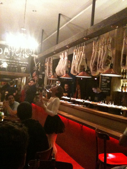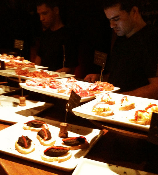 Tapas & Pintxos estão devidamente acomodados em grandes pratos de porcelana branca sobre o balcão do bar, são cerca de 30 opções, todas com preço. Basta escolher, colocar no prato e o garçon marca no seu cartão magnético na hora. Sobre as fatias de pães: jamóm, chorizo, queijo manchego, entre outras coisas. Há também tortillas (um tipo de omelete alto com batatas) e croquetes como o de paella. O cardápio segue por sanduíches e pratos tradicionais da cozinha espalhola; mas o povo vai lá mesmo é para “tapear”.